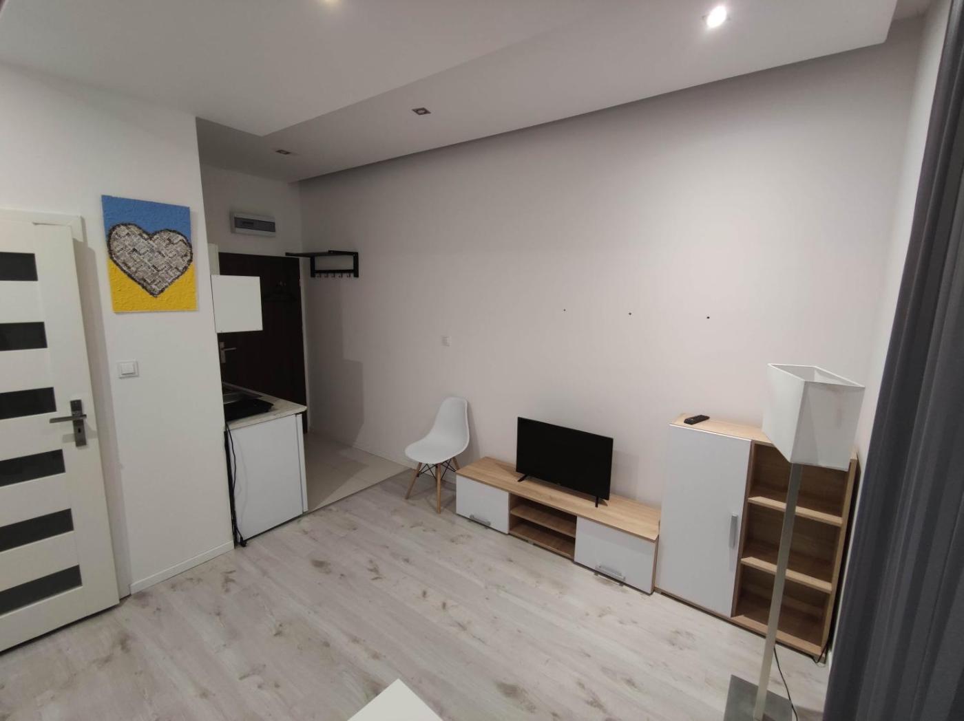 Studio. The studio provides a washing machine, a tea and coffee maker, as well as a private bathroom featuring a shower and a hairdryer. In the well-fitted kitchenette, guests will find a stovetop, a refrigerator, kitchenware and a microwave. The studio features a wardrobe, a sofa, heating and a flat-screen TV. The unit offers 1 bed. Studio - 2 osobowy. Powierzchnia pokoju ok.: 20 mkw. ;